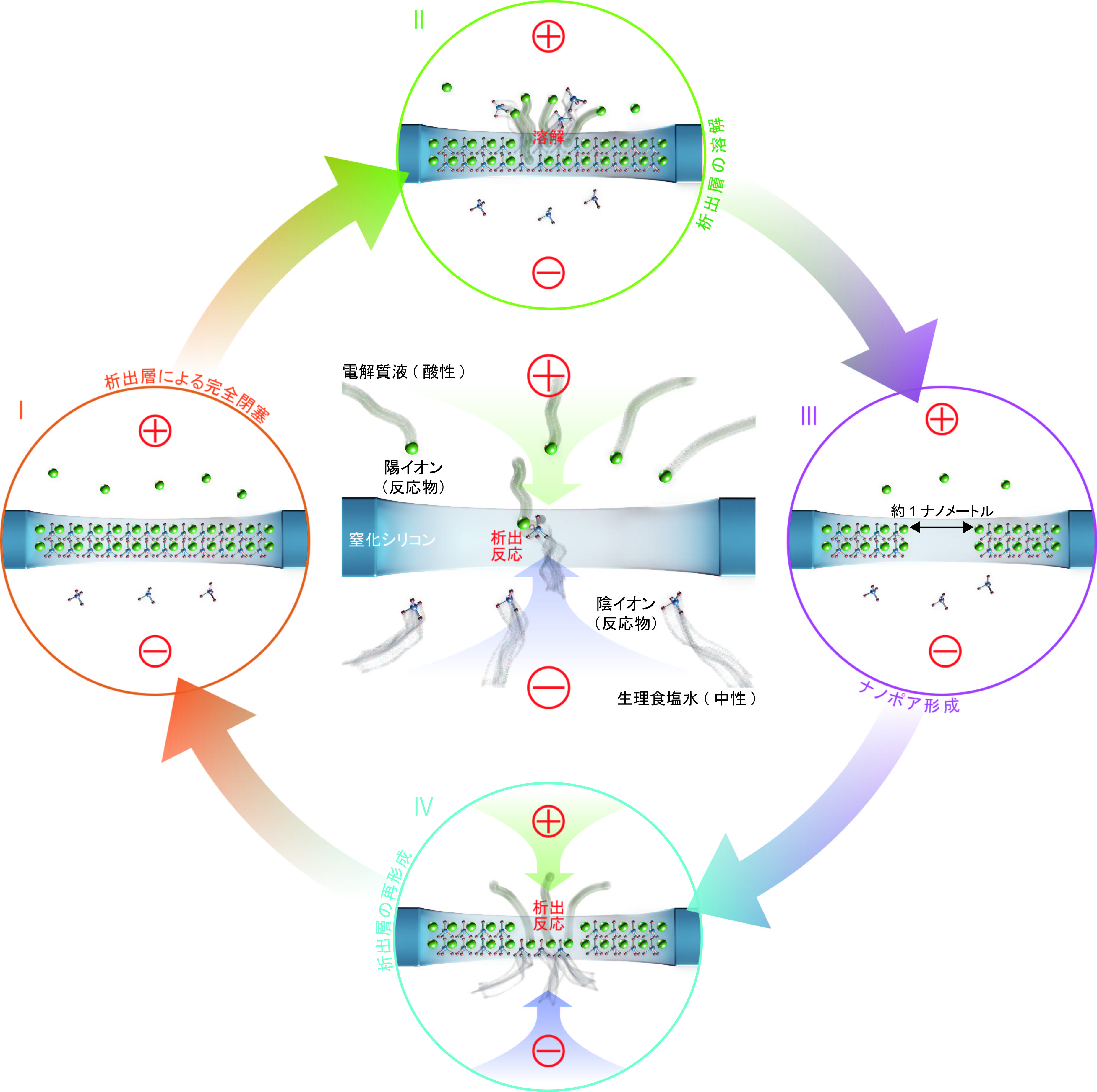 研究チームは、髪の毛の1000分の1ほどの大きさに相当する直径約100ナノメートルの穴を持つ窒化シリコン膜を作製し、両側に水溶液を入れて電圧を加える実験を行いました。すると穴の内部で、マンガンを含む溶液とリン酸を含む溶液が混ざり、固まり(沈殿)が生じて穴をふさぐ様子が観察されました。この固まりは、まるでフタのように機能し、電圧の向きや強さによって、穴が閉じたり、逆に溶けて開いたりすることが分かりました。
