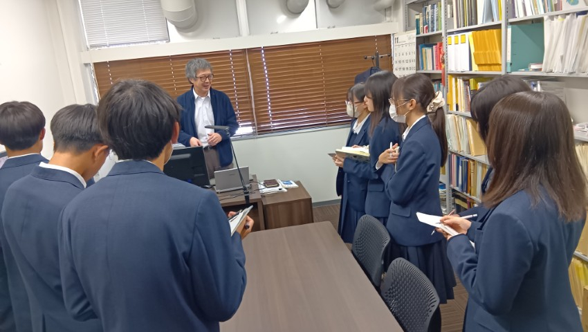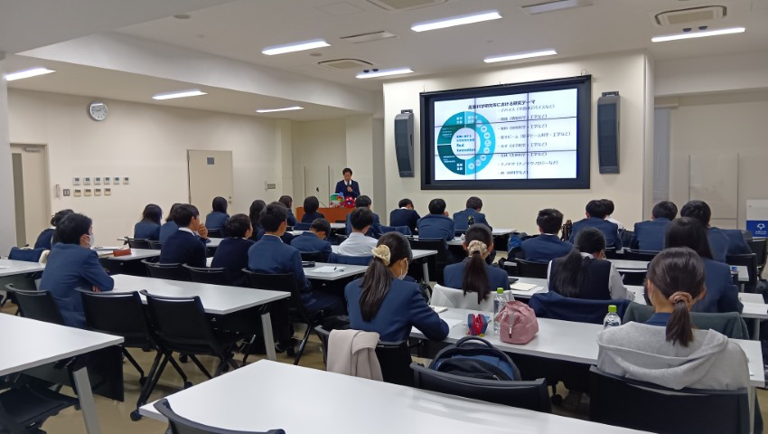 まず初めに、松本健俊准教授より「環境・エネルギー」をテーマにした講話をしていただきました。持続可能な社会を目指す革新的な取り組みについてのお話に、生徒の皆さんは興味深く聞き入っていました。