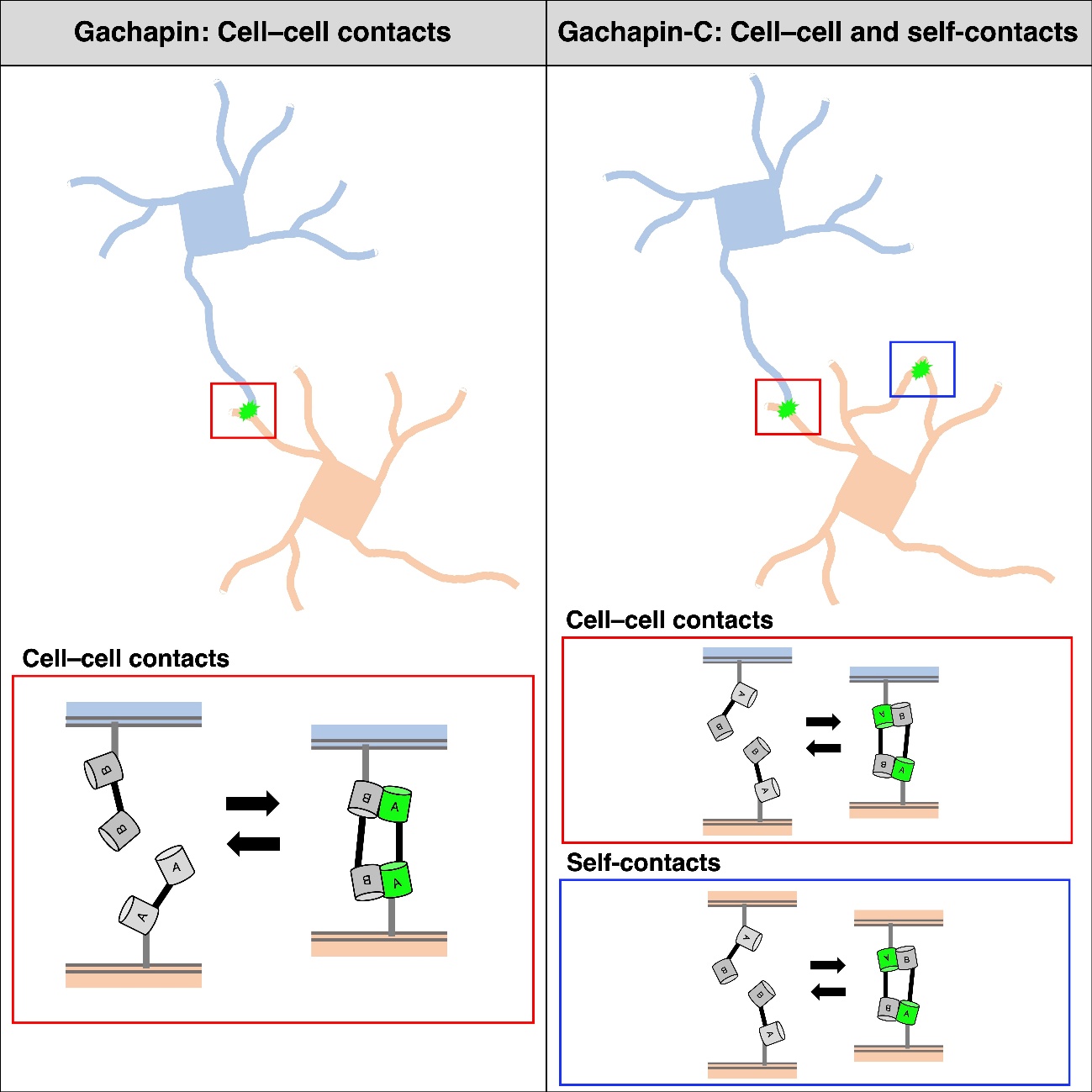 To address this, the researchers developed a new fluorescent marker called Gachapin. It has two parts: a fluorescent marker part that remains dark unless it is next to its binding partner, and a binding part that activates the fluorescent part upon close proximity. Because the binding part acts as an on/off switch for the fluorescent marker, Gachapin lights up quickly when cells touch and then turns off when the cells move apart.