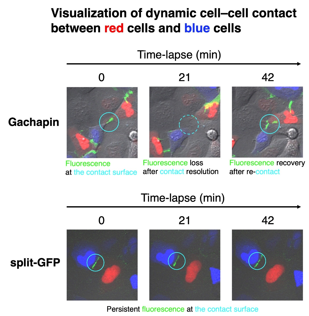 “Split GFP is useful for detecting the formation of stable connections between cells,” says lead author of the study Takashi Kanadome. “But because it takes time for the rejoined GFP to emit its signal and the association is irreversible, this approach cannot be used to detect dynamic cell–cell interactions in real-time.”