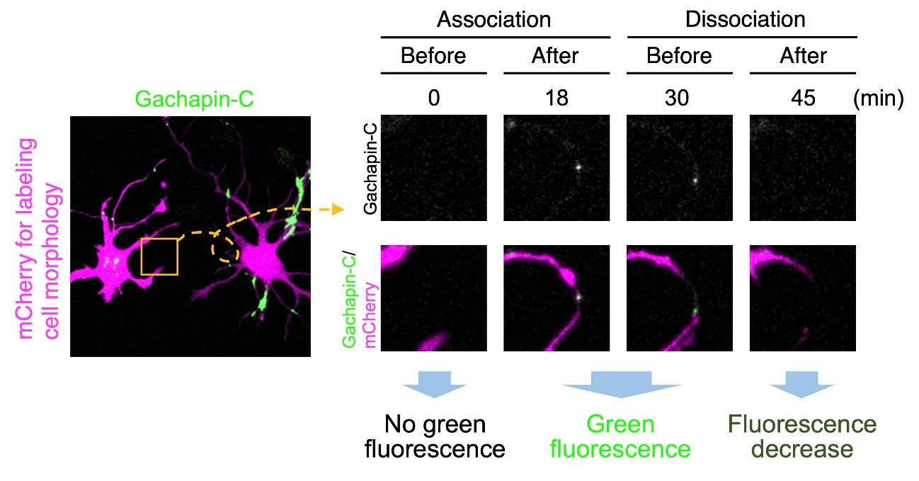 This study shows that rapidly activated one- and two-component fluorescent indicators can be used to monitor complex patterns of connectivity among a variety of cell types, including neurons. In the future, Gachapin and Gachapin-C are expected to advance neural circuit research and could help clarify the role of dynamic cellular interactions in brain disorders, leading to the development of new treatments.