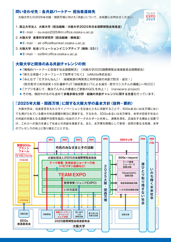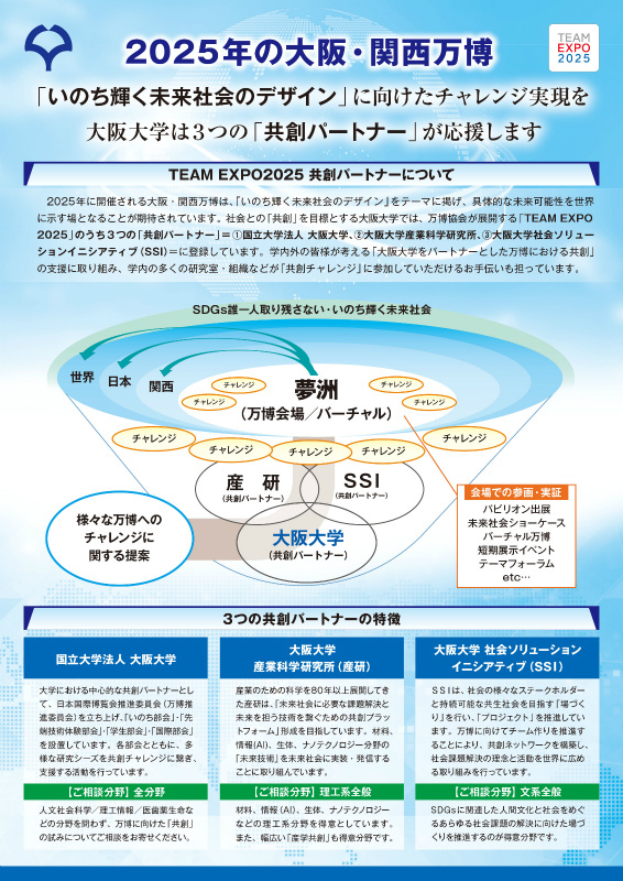 大阪大学は、産業科学研究所以外にも「国立大学法人 大阪大学」と「大阪大学社会ソリューションイニシアティブ(SSI)」の合計3つの共創パートナー登録を行っています。万博へのチャレンジを考える皆様が、どのパートナーにご相談に行くのが良いのか?ということの一助となればと考え、3組織の担当者が連携し、フライヤーを作成しました。