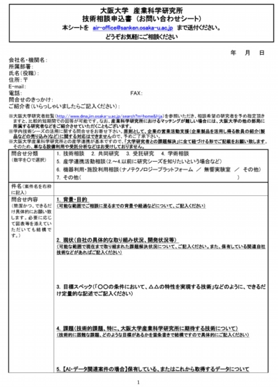 企業様の抱える技術課題の解決に関するご相談につきましては、Word形式もしくはPDF形式の「技術相談申込書 (お問い合わせシート)」をご活用ください。