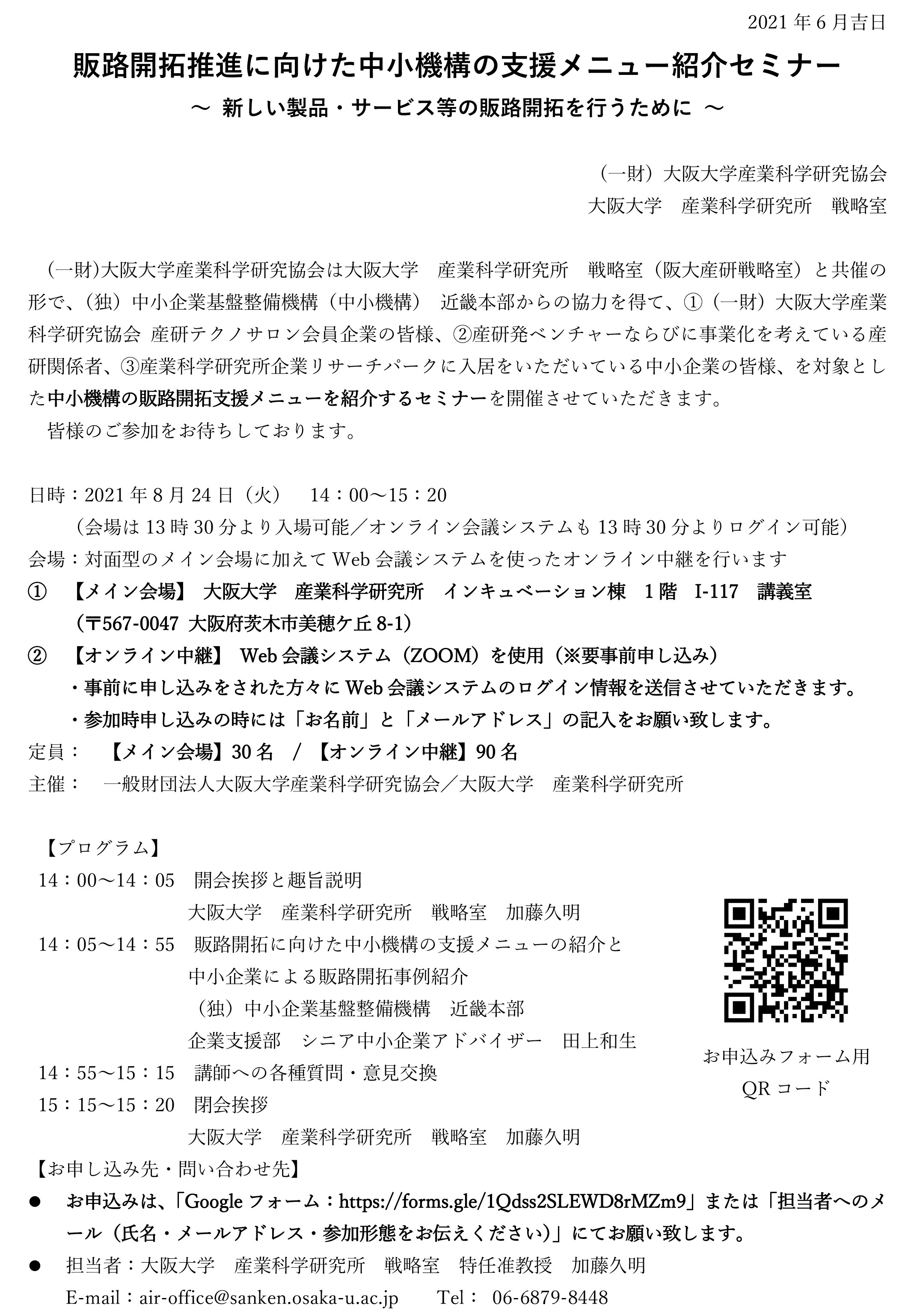 (一財)大阪大学産業科学研究協会は大阪大学 産業科学研究所 戦略室(阪大産研戦略室)と共催の形で、(独)中小企業基盤整備機構(中小機構) 近畿本部からの協力を得て、① (一財) 大阪大学産業科学研究協会 産研テクノサロン会員企業の皆様、②産研発ベンチャーならびに事業化を考えている産研関係者、③産業科学研究所企業リサーチパークに入居をいただいている中小企業の皆様、を対象とした中小機構の販路開拓支援メニューを紹介するセミナーを開催させていただきます。皆様のご参加をお待ちしております。