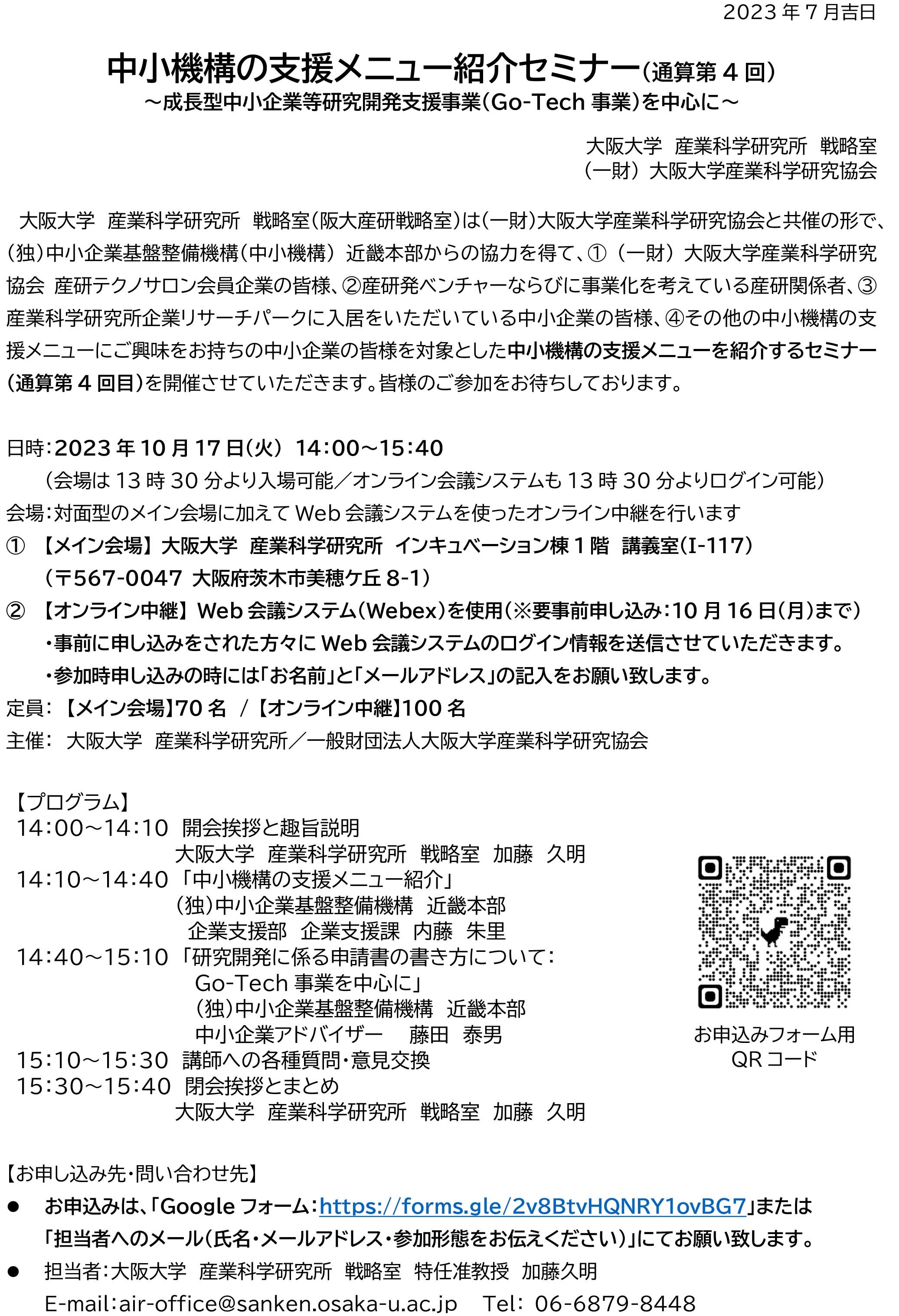 大阪大学 産業科学研究所 戦略室(阪大産研戦略室)は(一財)大阪大学産業科学研究協会と共催の形で、(独)中小企業基盤整備機構(中小機構) 近畿本部からの協力を得て、① (一財) 大阪大学産業科学研究協会 産研テクノサロン会員企業の皆様、②産研発ベンチャーならびに事業化を考えている産研関係者、③産業科学研究所企業リサーチパークに入居をいただいている中小企業の皆様、④その他の中小機構の支援メニューにご興味をお持ちの中小企業の皆様を対象とした中小機構の支援メニューを紹介するセミナー(通算第4回目)を開催させていただきます。皆様のご参加をお待ちしております。