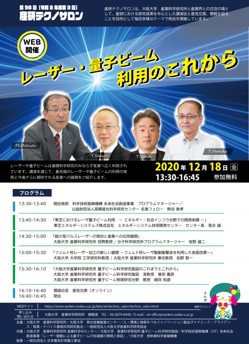 共催:大阪大学 産業科学研究所 産業科学AIセンター/大阪大学 産業科学研究所 量子ビーム科学研究施設/科学技術振興機構(JST)未来社会創造事業「レーザー駆動による量子ビームの加速器の開発と実証」/大阪大学 放射線科学基盤機構