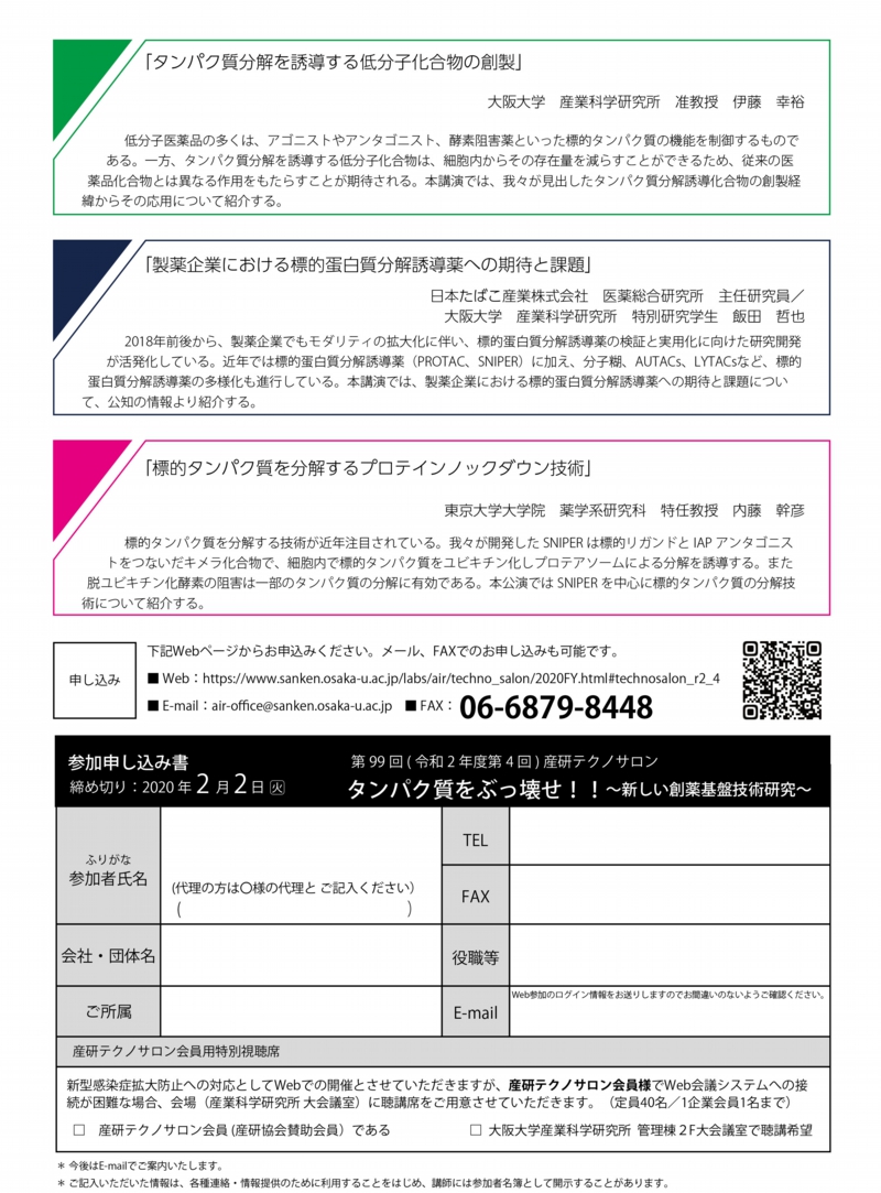 (定員最大20名;一般財団法人大阪大学産業科学研究協会 テクノサロン会員でWeb会議システムへの接続が困難な方向けへの聴講席となります。感染症対策のため、会場人数に制約があるため、1企業会員あたり1名までとさせていただきます)