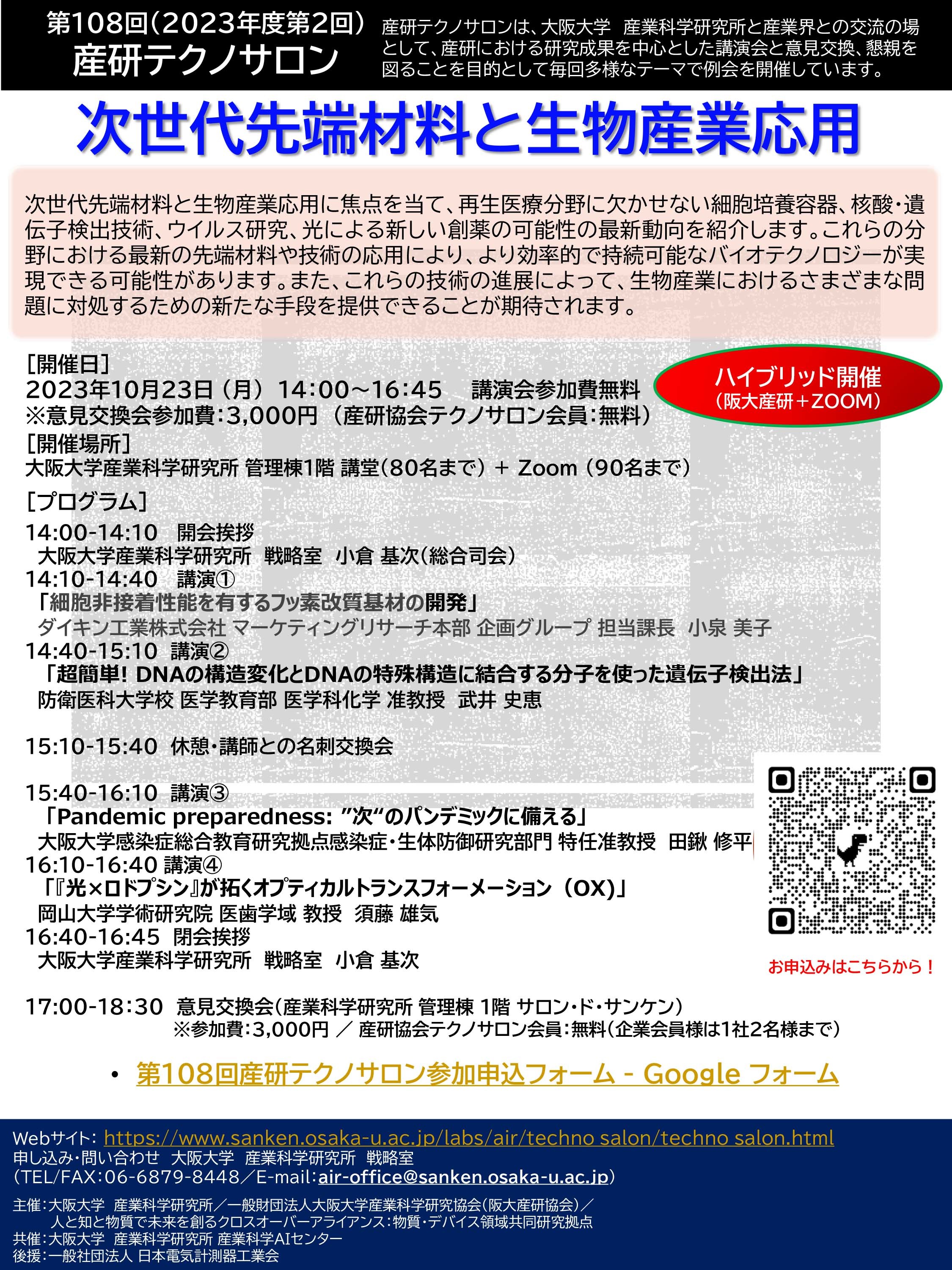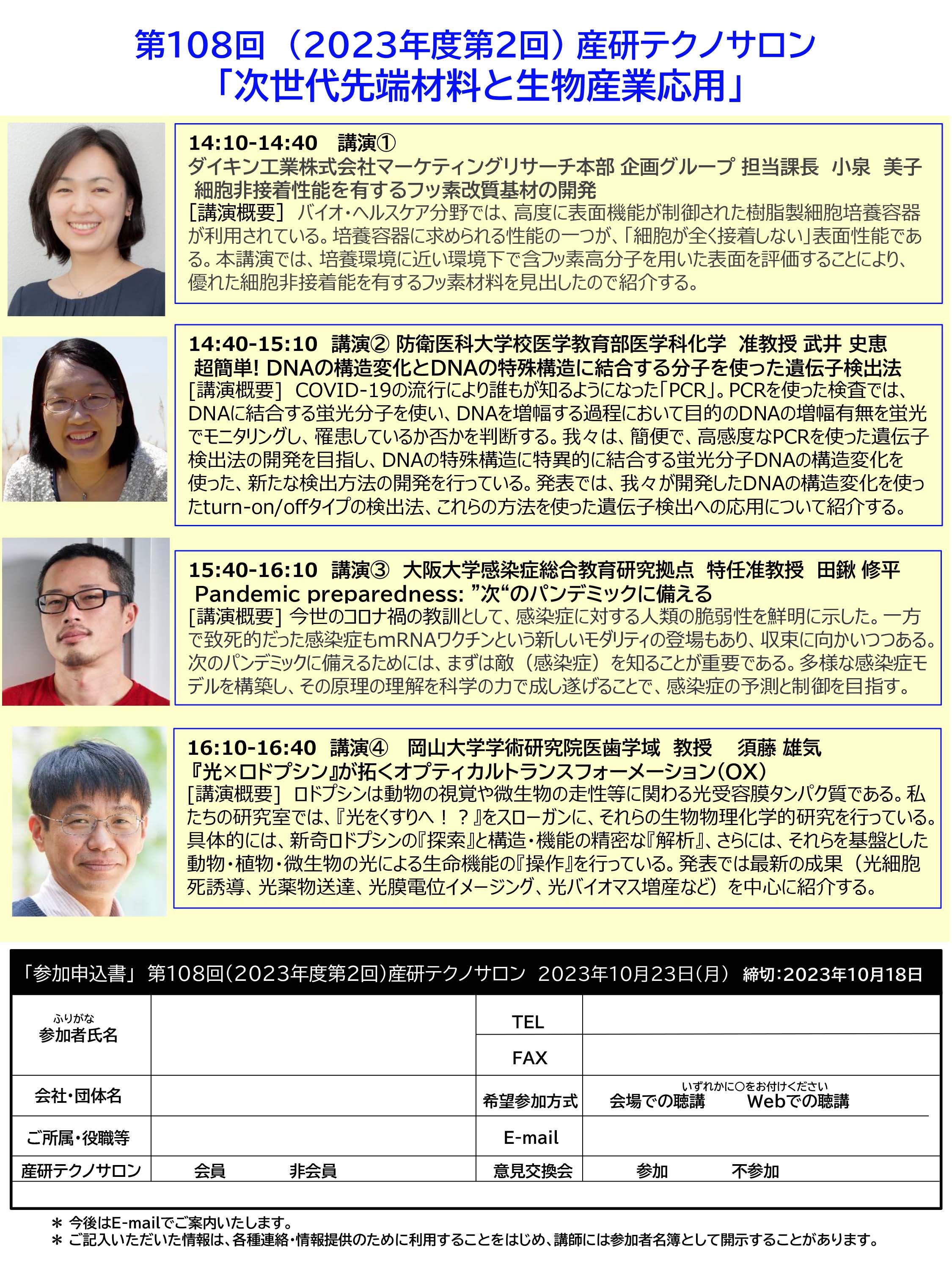 【フライヤー (2023/9/28更新)】 第108回産研テクノサロンフライヤー(PDF)
