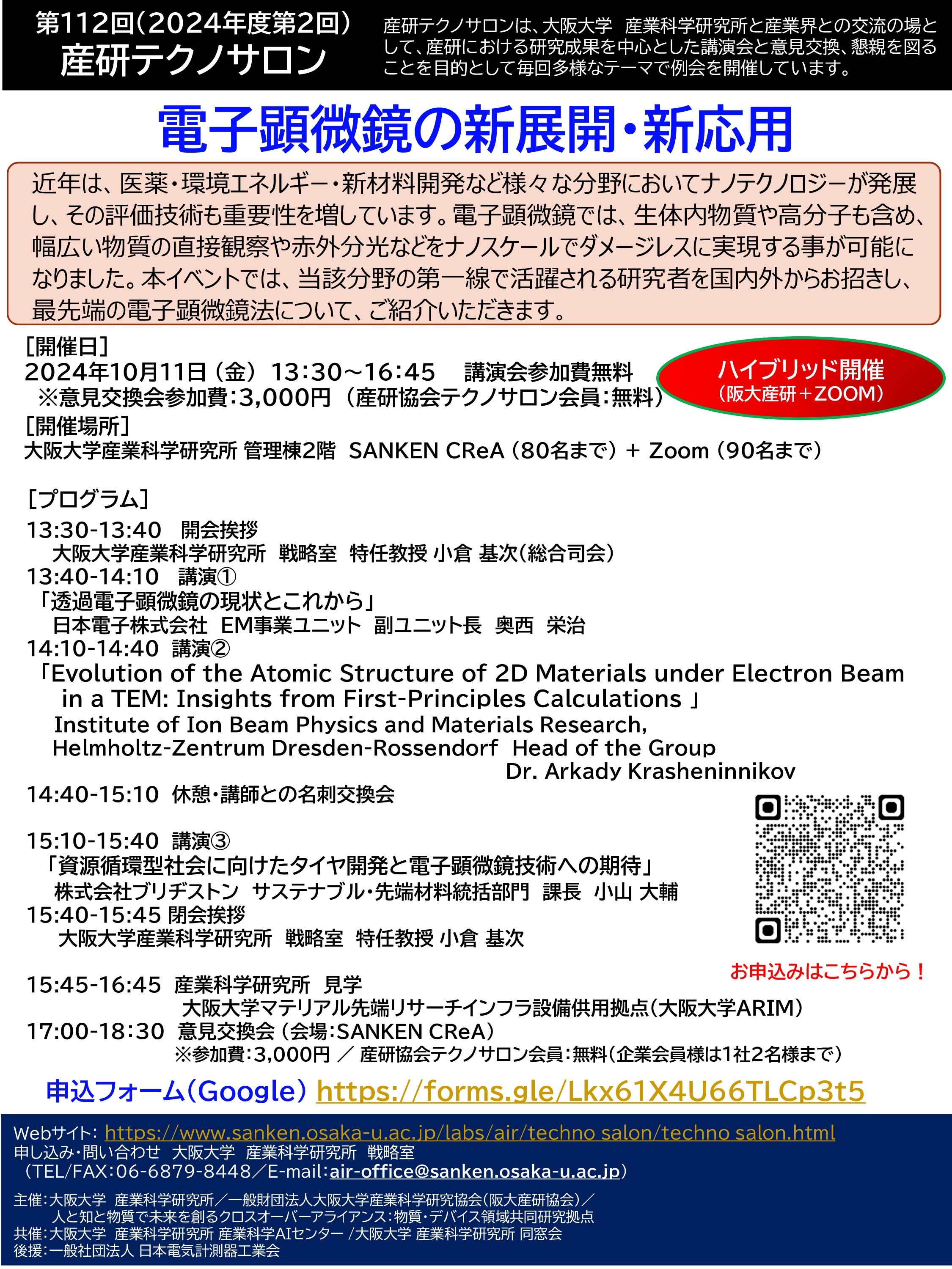・【講演会】大阪大学産業科学研究所 管理棟1階 講堂[予定](最大80名)+Web会議システム(ZOOM)を利用したハイブリッドWeb講演会(オンライン参加者:最大90名)