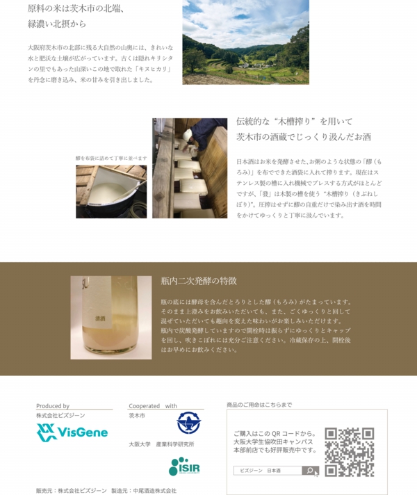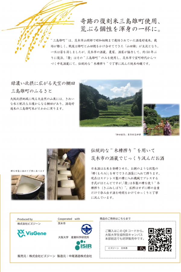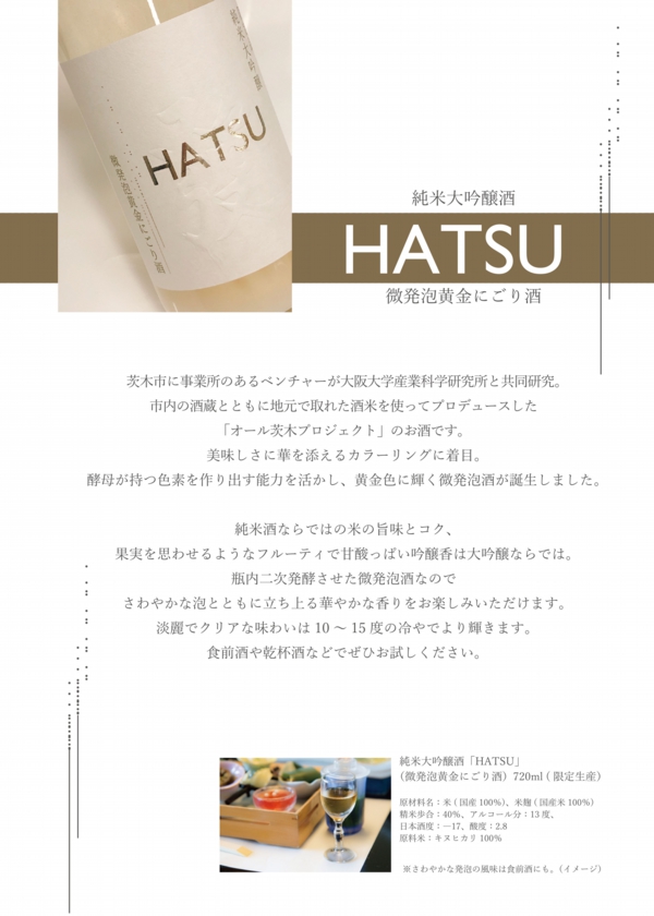 阪大産研発ベンチャーである株式会社ビズジーンと阪大産研 黒田研究室との共同研究「酵母遺伝子の解析と発酵に関する研究」の成果物として日本酒を製造しました。これは、大阪府茨木市が位置する阪大産研がオール茨木(茨木市の予算、茨木市の酒米、茨木市の醸造家、茨木市の阪大産研と阪大産研発ベンチャーの成果)のプロジェクトで開発を手掛けた成果物です。阪大産研が常に目指す研究成果の社会実装だけでなく、阪大・阪大産研による地元茨木市への社会貢献にも繋がっています。