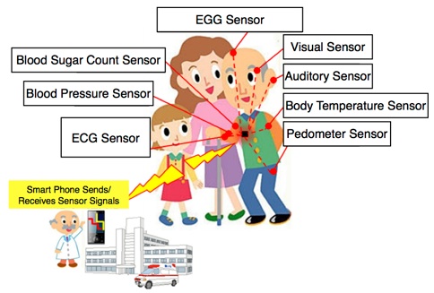 Health product examples include wearable sensory devices for EGG/brain waves, vision, hearing, body temperature, footstep counts, blood sugar level, blood pressure, pulse numbers and so on. These sensory tools will emit signals to, and receive from, hospitals and other medicare organizations so that there will be appropriate, quick and efficient diagnosis for better quality of life.